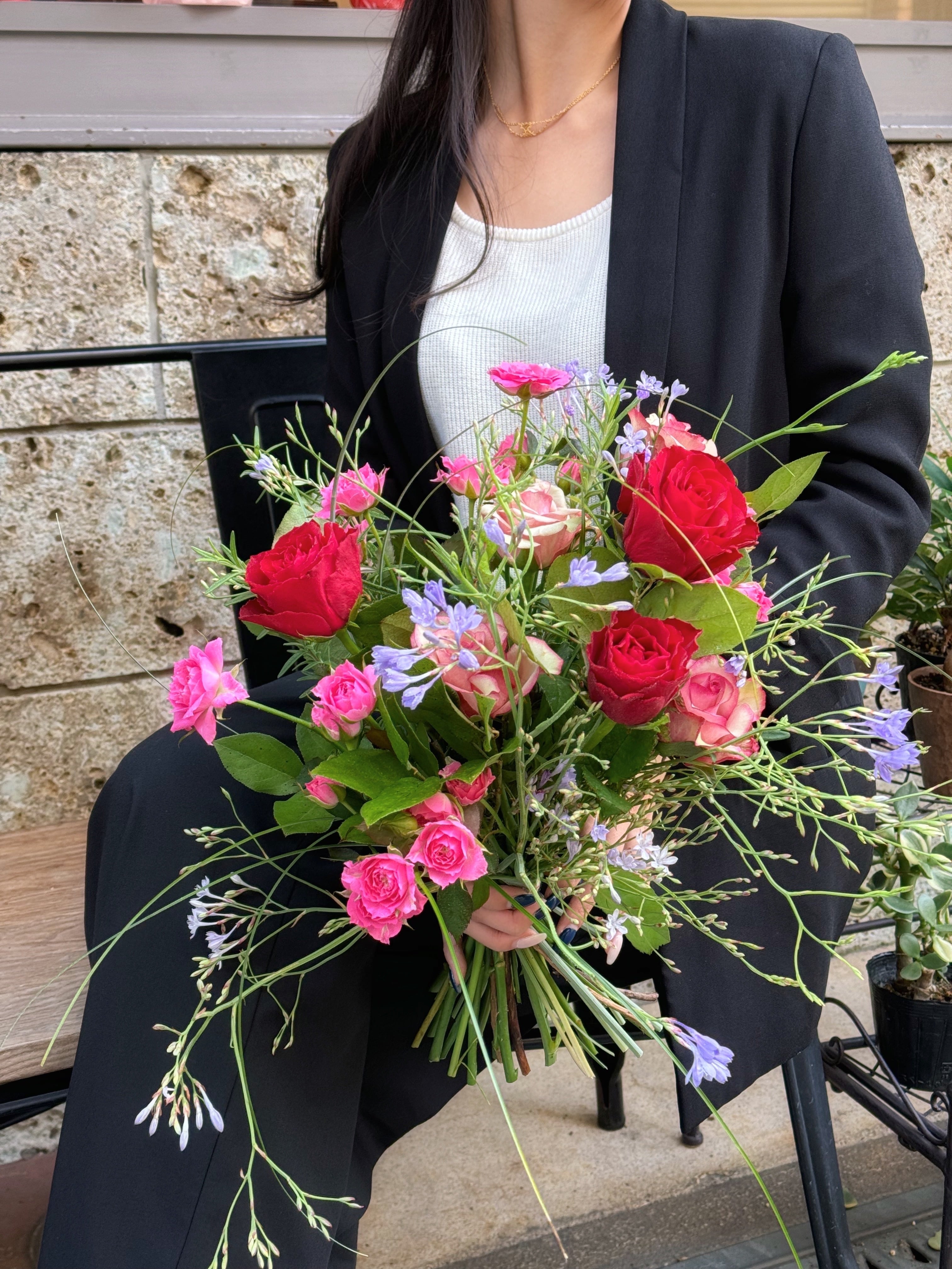 花束 -Middle- 程よいボリュームのあるMサイズの花束は、様々なお花やグリーンを楽しんでいただけるブーケです。 大切な記念など、いつもよりちょっと特別な日の贈り物に。 *色味はお選び頂けますが、お花の種類のご指定は出来かねます。