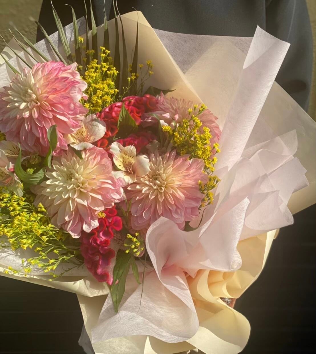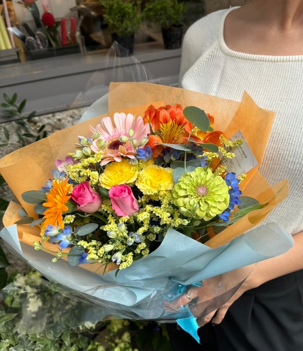 程よいボリュームのあるMサイズの花束は、様々なお花やグリーンを楽しんでいただけるブーケです。
